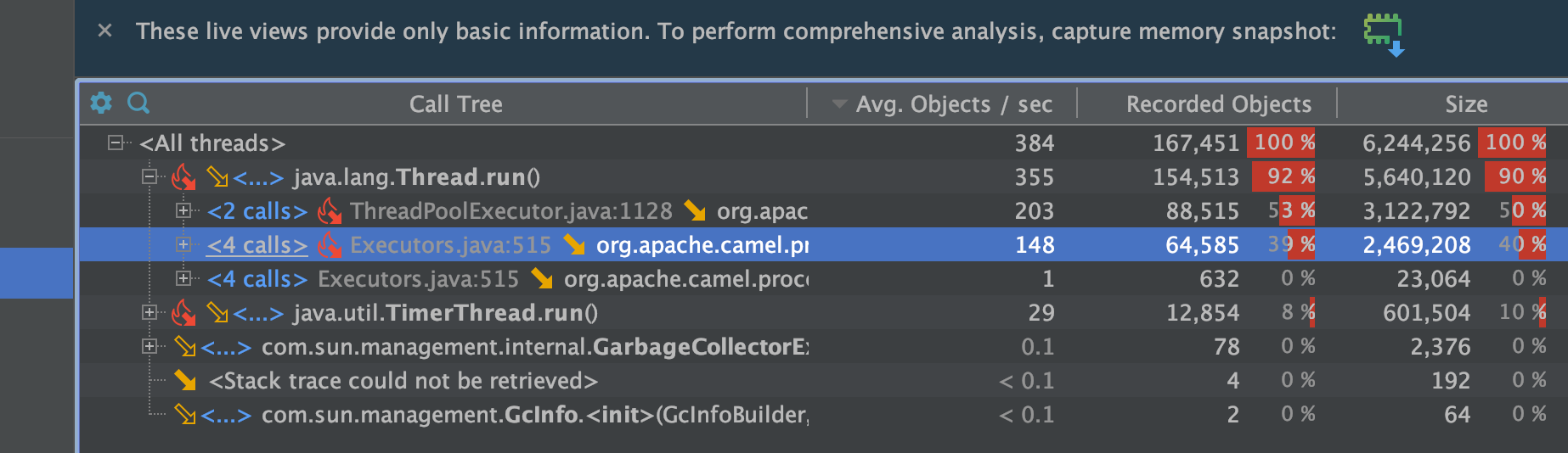 The top screenshot is using Camel 3.5 and the bottom 3.6. At the top, we can see the threads are blocked in Camel’s resolveLanguage method. And in 3.6 then it’s the log4j logger that is blocking for writing to the log file. Both applications are using the same Camel application and have been running for about 8 minutes.